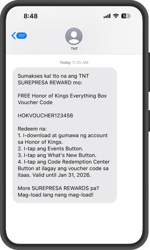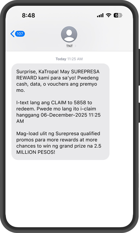 Pagkatapos mo mag-load ng qualified offer, makakatanggap ka ng SMS tungkol sa iyong Surepresa Reward. Siguraduhing mag-text ng CLAIM to 5858 para makuha ang iyong reward.